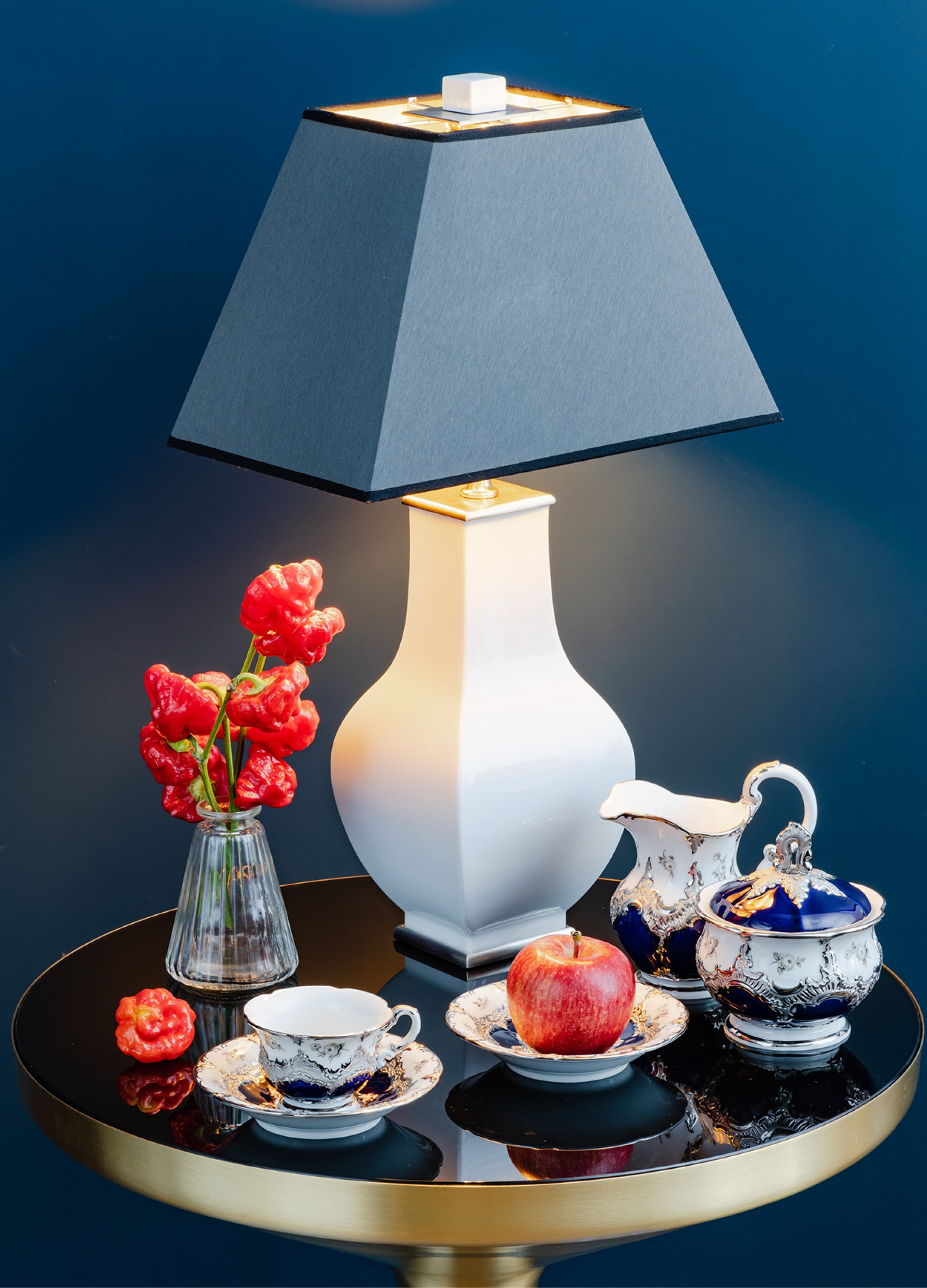 ROYAL BLUE PLATINUM WITH STREWN ROSESFor what would have this year been Leuteritz’s 200th birthday, his successors have designed a new set that hits a more modern note of opulence – glazed royal blue with platinum and scattered roses in a sepia tone, this service set combines the splendour of banquets of the past precisely with a modern expression of lavishness. The platinum, used for the very first time on this set, lends an elegant and modern note to the classically ostentatious of the gold pieces. In combination with the sepia paintwork, the platinum boasts a more modest and somewhat reserved effect. The colour allows the motifs to shine in a brand-new light, merging historical heritage with a contemporary sensibility.