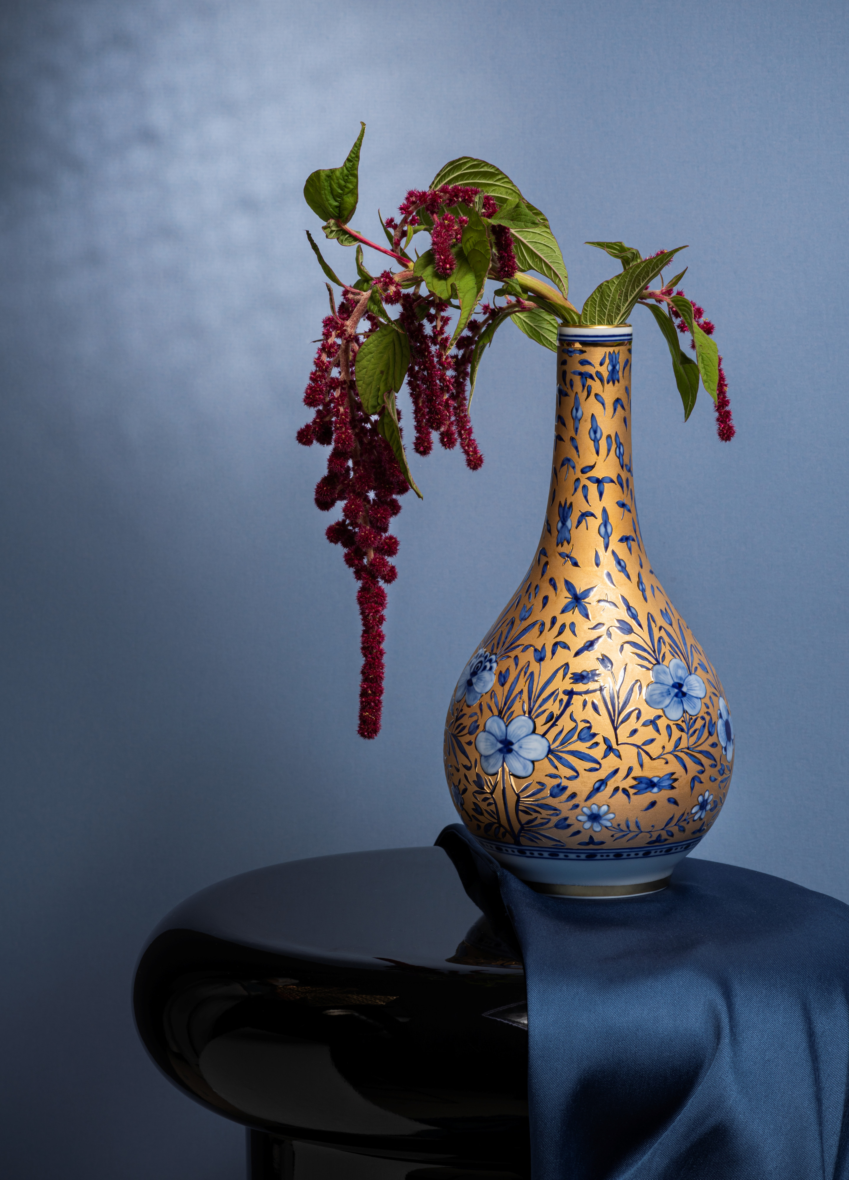 This art piece in the form of an early Chinese water bottle is very symptomatic of those fledgling years. Superb pattern of flowers and leaves are scattered with rhythmic regularity over the vase’s shapely body after consulting graphic sources in the manufactory’s own archives. The flowers are painted onto the as yet unglazed, absorbent porcelain in cobalt blue that immediately sinks into the unfired body. The colour only acquires its full intensity once it has been glost-fired, whereupon its initially rather greyish hue is transformed into the brilliant cobalt blue that is also used for the Crossed Swords, the trademark by which the Manufactory is instantly recognisable the world over. Contrasting most exquisitely with Mehner’s blue-and-white scheme is a new style of painting in gilt in which 24-carat gold is applied to the fired-but-unglazed “biscuit” surface and takes on a matt appearance once it has itself been fired.
