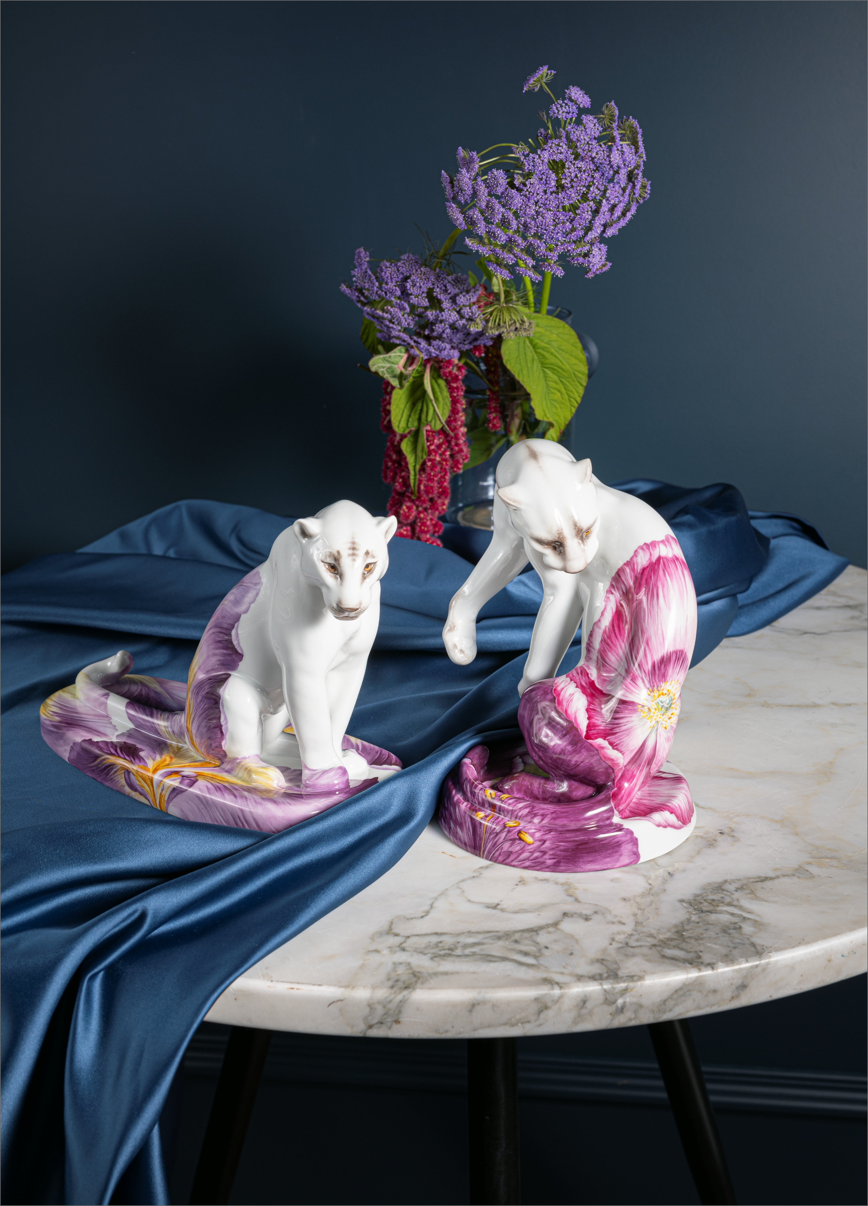 Having first been applied to a floor vase and other works of art by MEISSEN artist Lena Hensel, the pattern has now been extended to two vibrant models of panthers. They nestle against and envelop their feline hosts. The interplay of colours so typical of the pattern is what has been focused on here, too: shades of lilac and purple are augmented by various nuances of yellow.