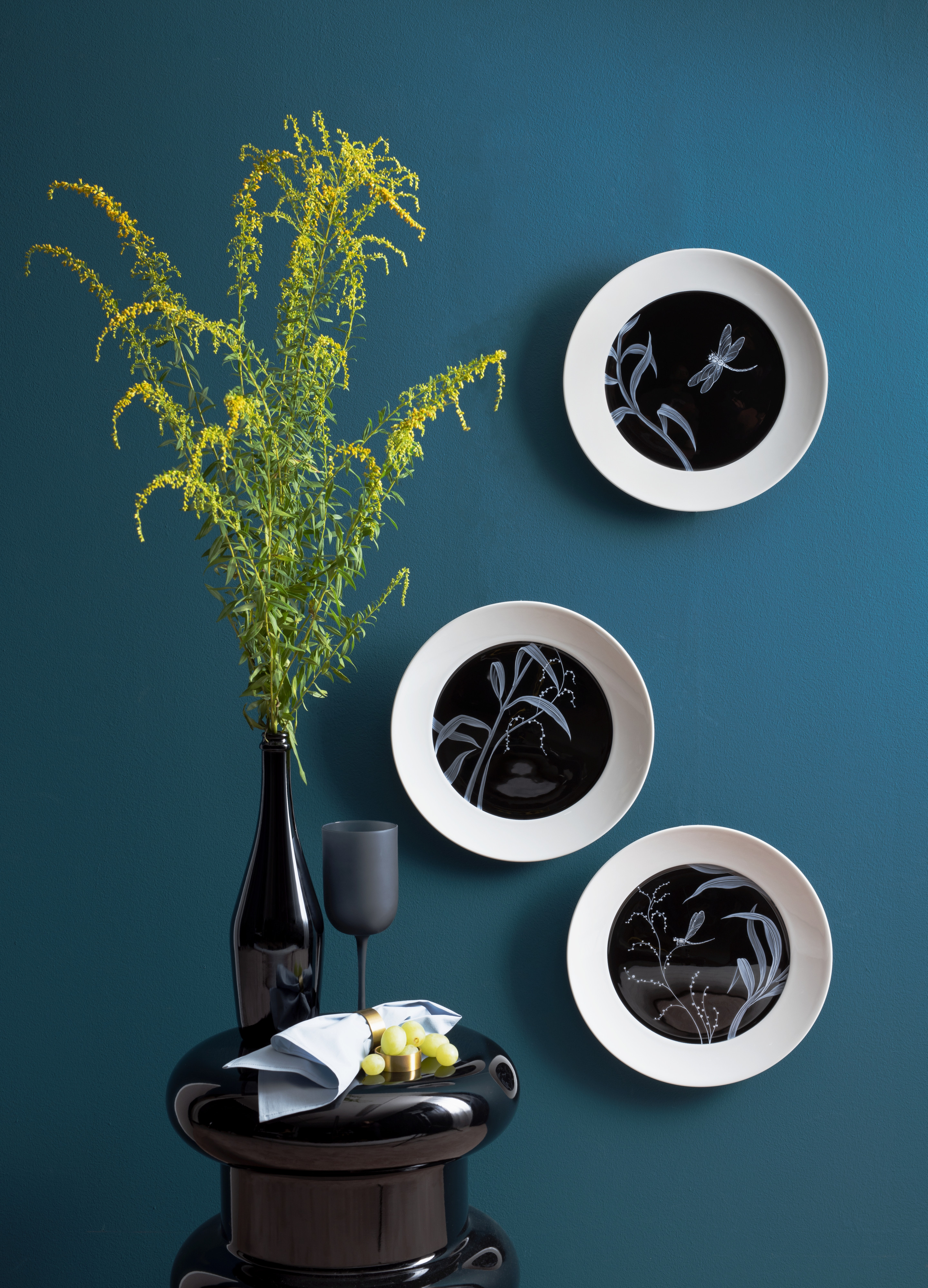 “Grasses and Dragonflies” is a modern triptych that revives the traditional method of Limoges painting in a breezy contemporary manner. The three plates are each decorated with different eelgrass motifs that work well both together and alone. With a steady hand the nature motifs are build up through the application of multiple layers of white porcelain paint to a black-glazed ground. Where applied fewer layers of colour, the resultant images were virtually translucent; the way they contrast with their dark background gives rise to a captivating sense of depth whilst also evoking the atmosphere of a moonlit night.