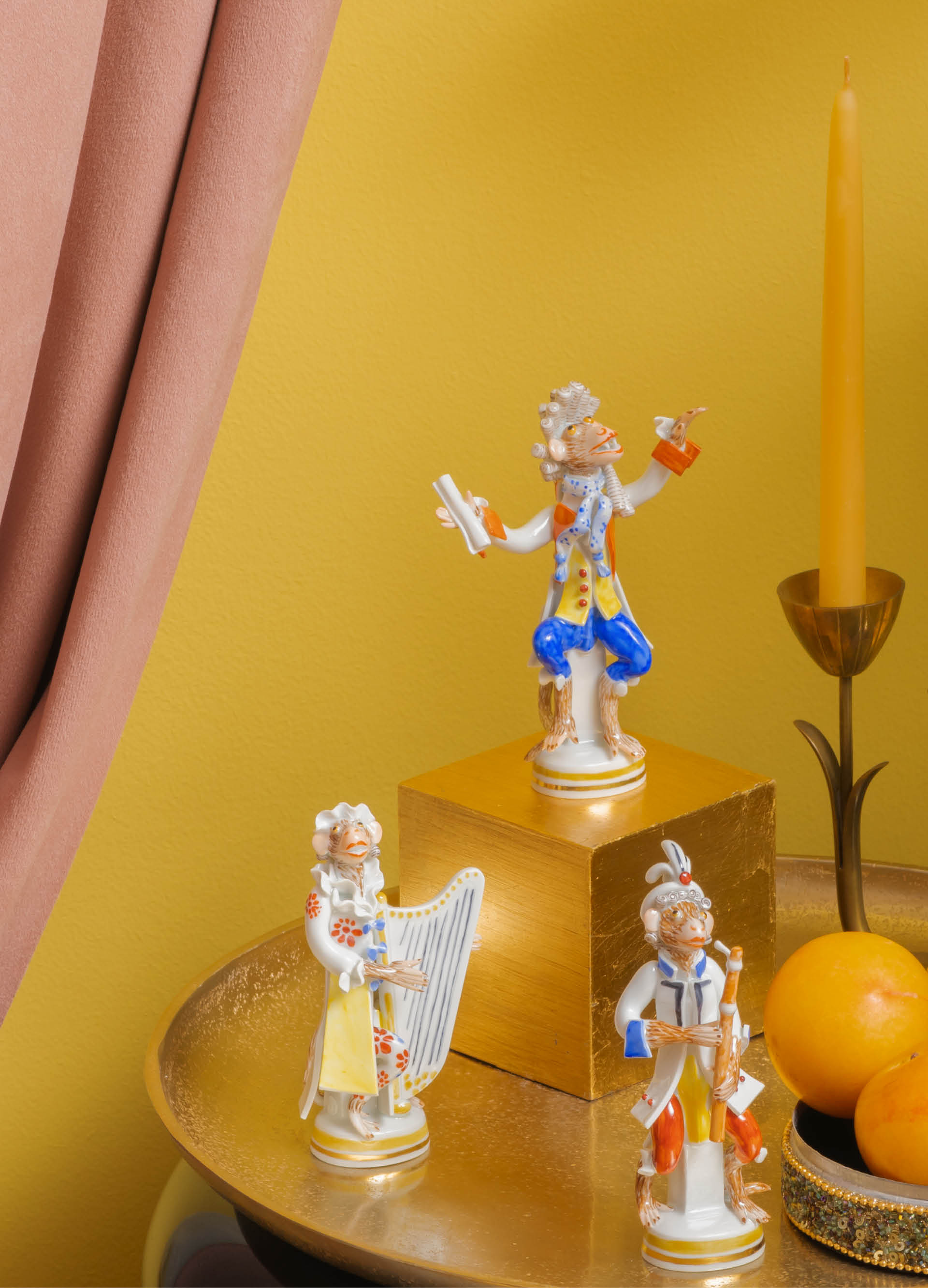 Modelled after drawings from famed French singerie artist Christophe Huet, the “Monkey Orchestra” is an ensemble of Rococo-outfitted primates, produced with elaborate craftsmanship and painted in rich detail. The earliest of these figurines quickly made their way from the Meissen kilns straight to Paris, where Madame de Pompadour, mistress to King Louis XV, was one of the first recipients of the collection in 1753.