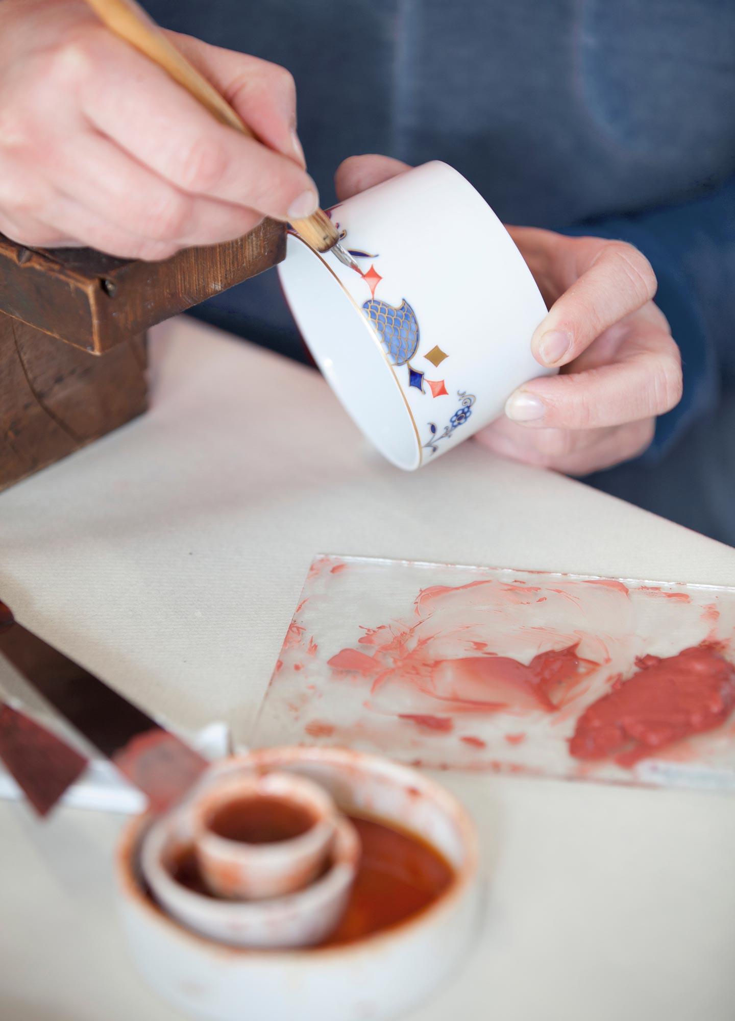 Two special porcelain painting techniques are used in the creation of the “Noble Blue” design, both of which demand the ultimate in precision and attention to detail. During the under-glaze painting step, the manufactory’s cobalt blue paint is first applied to the unglazed porcelain by hand with fine brushstrokes. The porous biscuit immediately absorbs the paint, making any corrections impossible. The pattern now appears in a matte grey colour. It is only after glazing and the subsequent glost firing that the blue starts to shine. Special in-glaze paints are used for the subsequent red and gold detailing. Applied by hand with a steel spring, these colours sink into the glaze easily during the next decorative firing and are thus protected by it. A final polish brings out the lustre of the gold detailing.