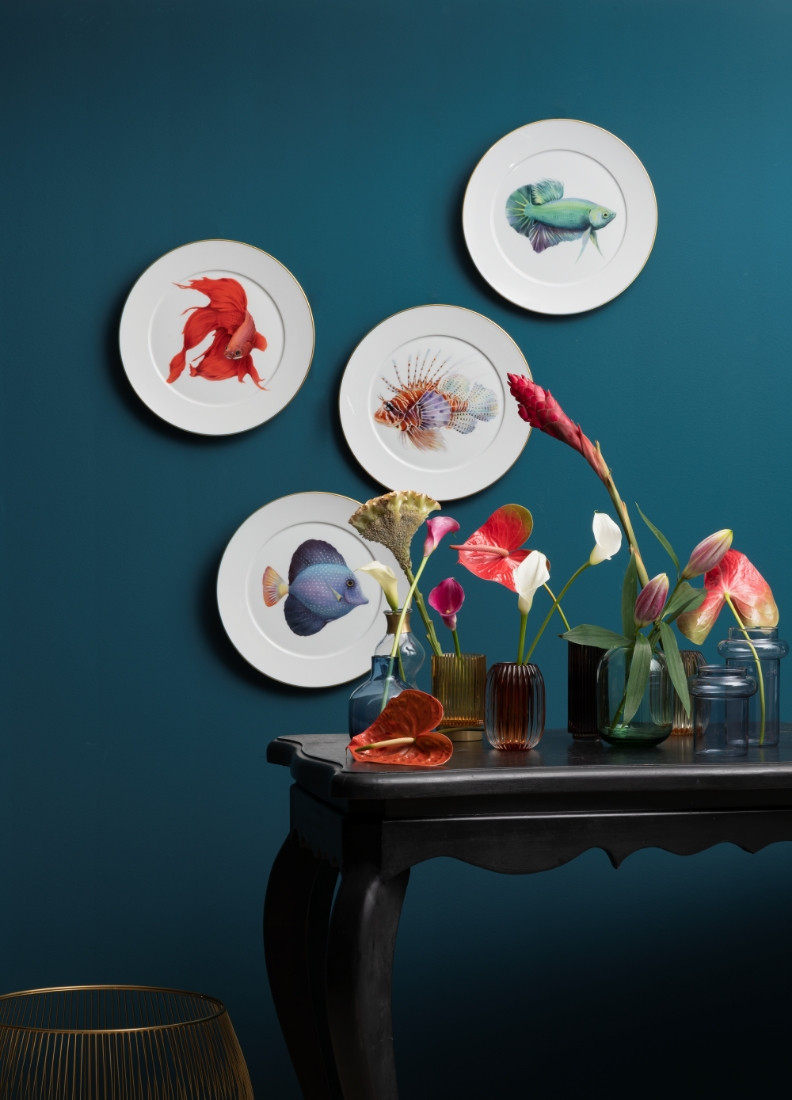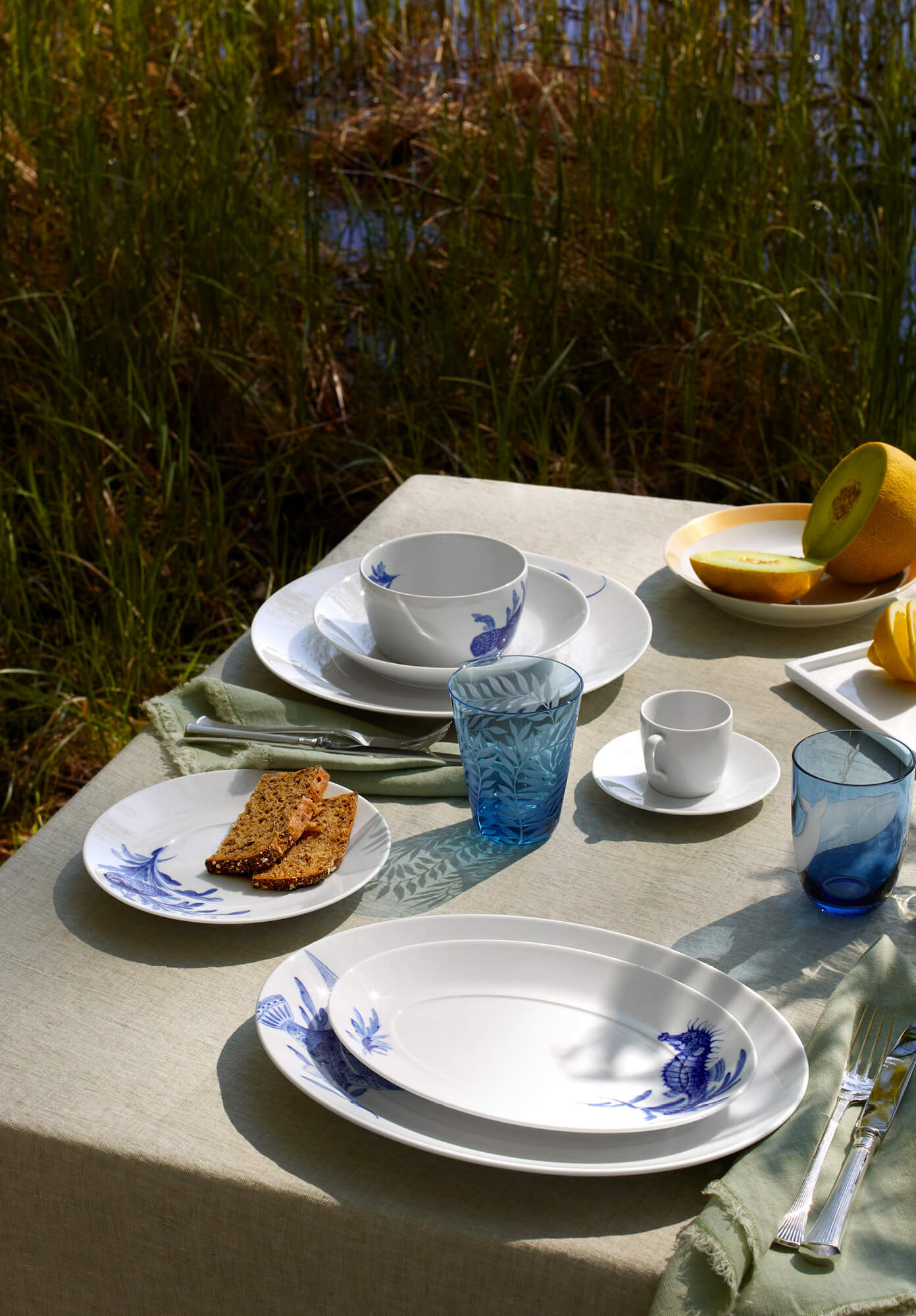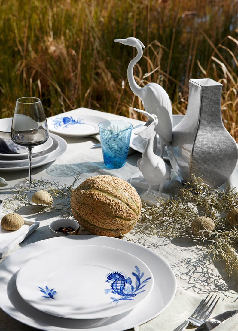 As if guided by gentle waves and a sea breeze, the flowing brushstrokes of the maritime decors capture a fascinating underwater world on plates, vases and vessels in luminous blue painting and allow a maritime summer ambience to take hold in one's own interior.