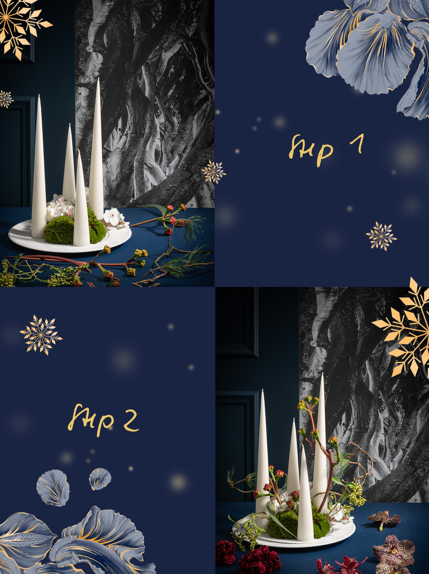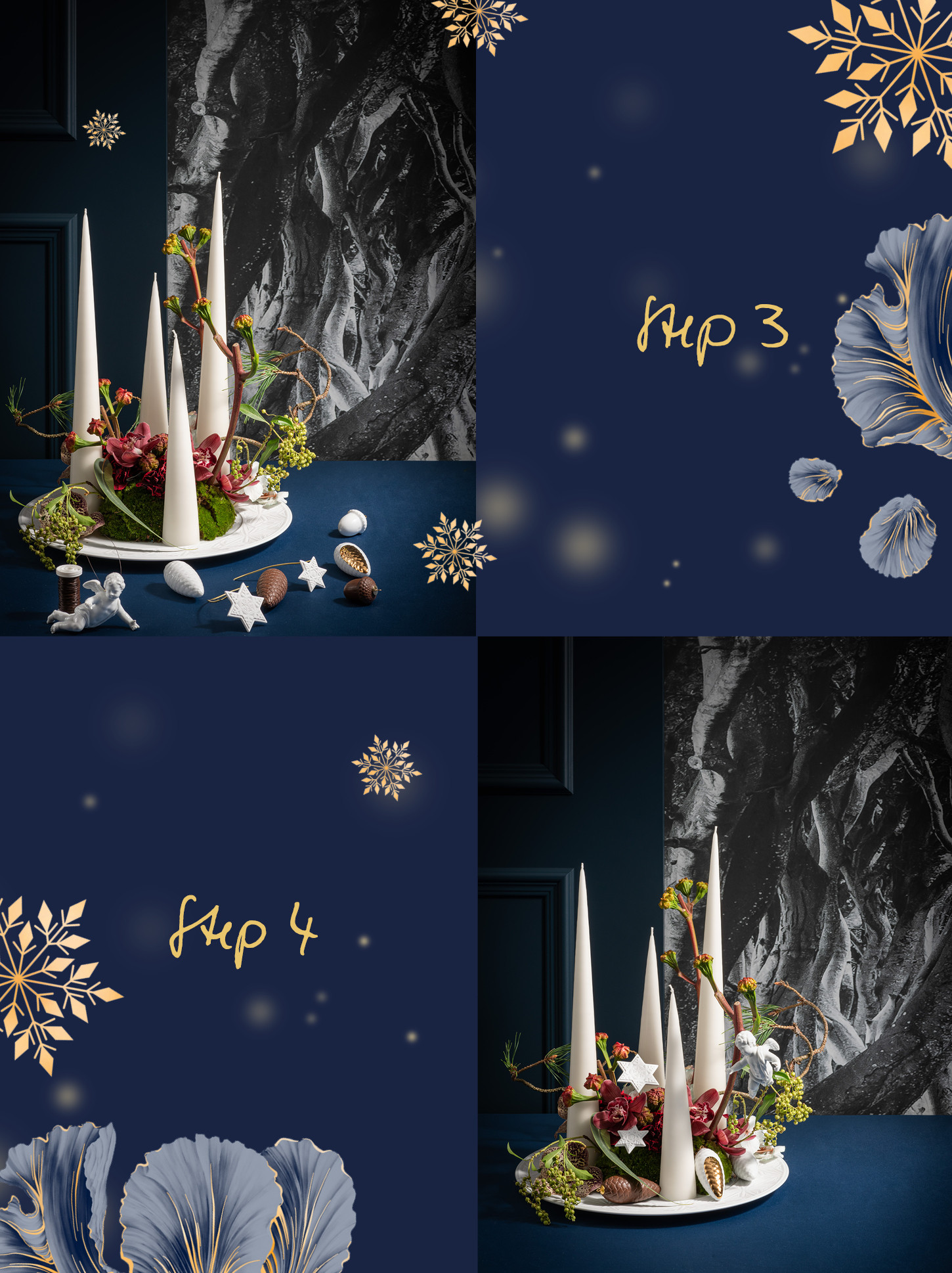 1. Place moist plugging compound in the centre of your favourite MEISSEN plate and cover it with fresh moss. This will keep the Advent wreath fresh for a long time.