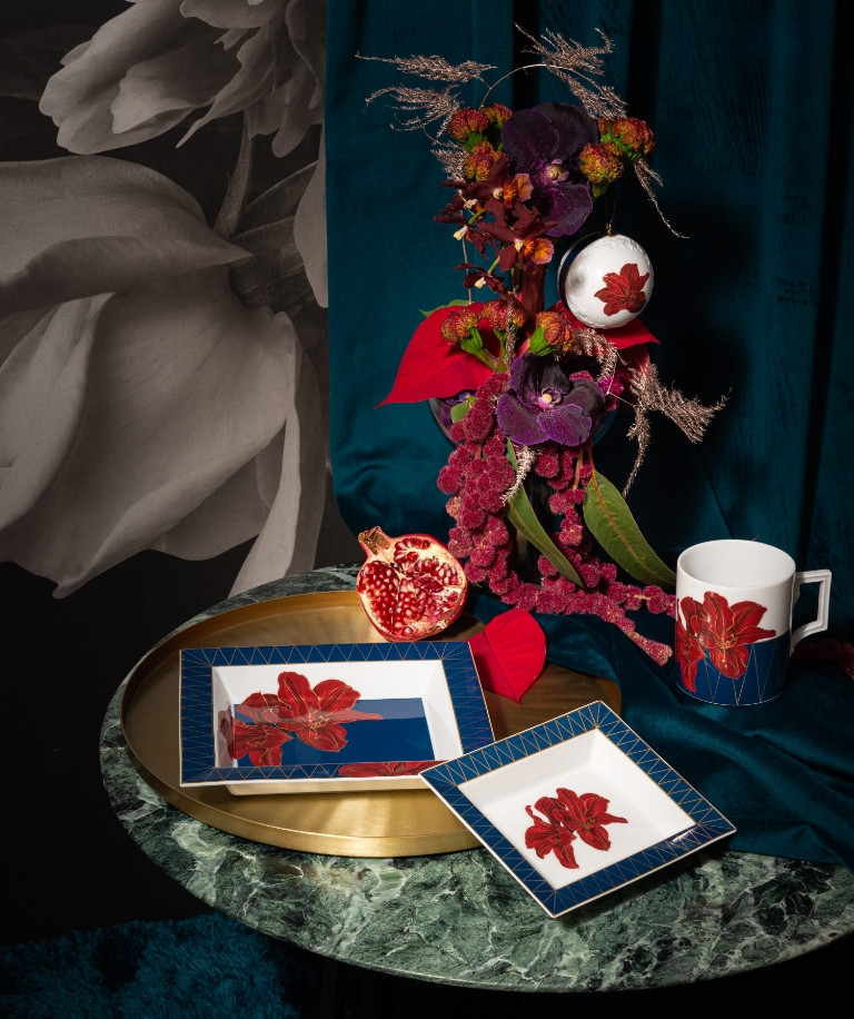 2. Decorate the plate with long-stemmed flowers, filigree branches and red blossoms according to your taste. We chose Cambria orchids and Asparagales.