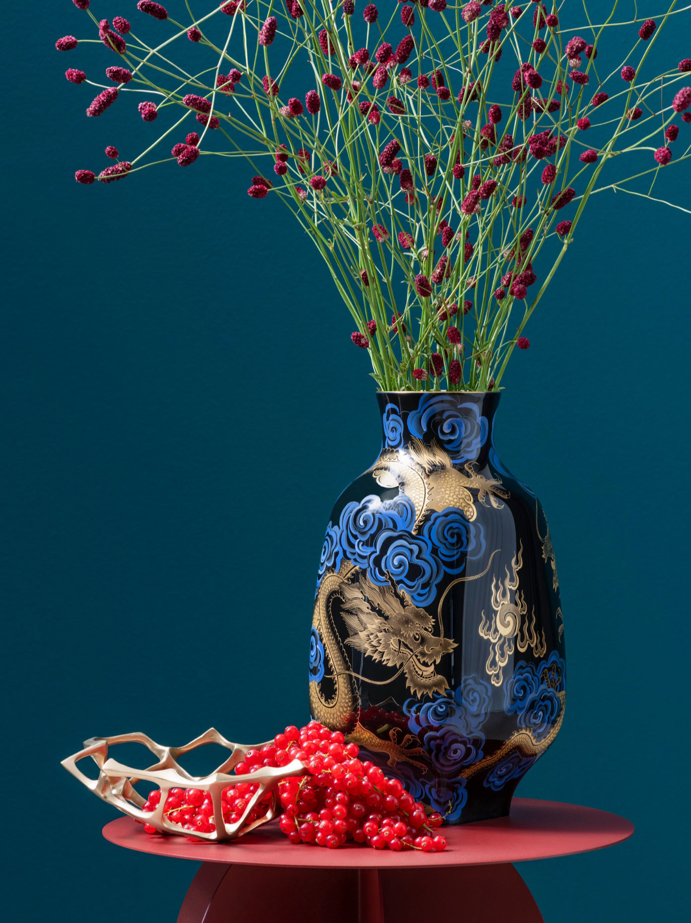 Another year is coming to an end, time to take a break and look back at the last few months. 2022 was characterized by contrasts. The year's motto "Far & Fantasy - Discover the Unexpected" whisked us away into a world full of fantastic porcelains, exotic décor and strange mythical creatures. The "Giant Bloom" series from the previous year was complemented by additional art pieces. On large murals and plates, colorful poppies and iris blossoms compete with exotic tiger lilies. The Bloom Collection was the first jewelry collection, where the entire development of a lily, from bud to full blossom, are made sculpturally visible. After several years of development, we succeeded in the complicated production of shimmering porcelain pearls, which can be admired in our exclusive Pearl Collection. The winged lioness - half griffin, half dragon - adorned our Christmas collection this year and evokes associations with sphinxes and mighty angels. The fantasy journey was worthily completed with the birth of our new lucky dragon, as the highlight of our limited edition artwork.