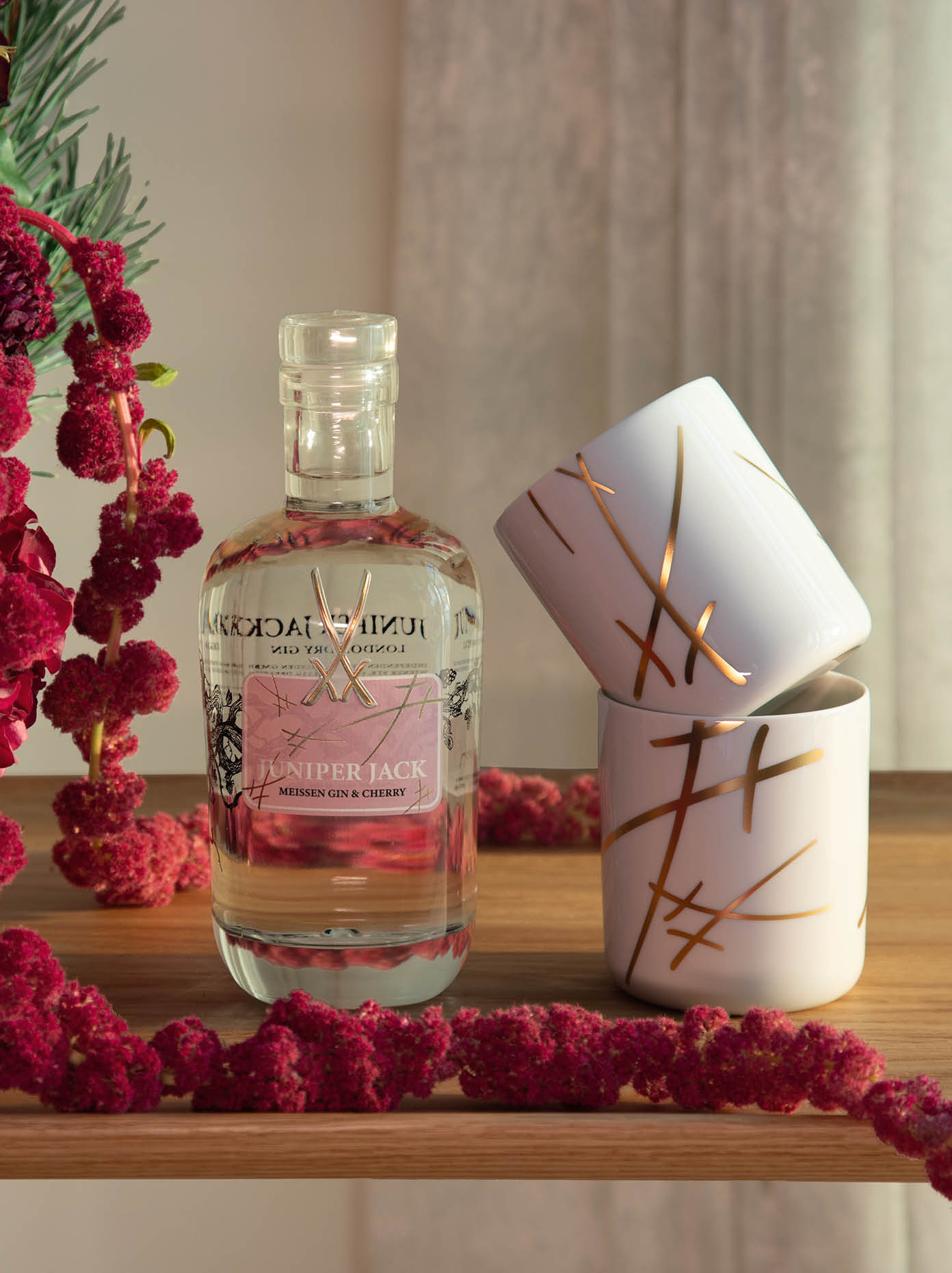 The Cherry Gin Fizz is a real classic - a cocktail that combines the fruity sweetness of an aromatic cherry infusion with the sparkling freshness of soda. Refined with a hint of cinnamon and decorated with fresh cranberries and a cinnamon stick, this drink can be a highlight of any Christmas party. Served in the elegant gin cups with the golden Swords decoration made of Meissen porcelain, it not only brings festive flavor but also a touch of style to the table. The 3-piece MEISSEN gin set with the exclusive JUNIPER JACK MEISSEN Gin & Cherry and the two “Swords” gin cups offers everything you need for this and is not just a perfect gift for gin lovers. A wonderful collaboration and an unsurpassed combination of masterful craftsmanship and first-class enjoyment that perfectly rounds off the festive season.