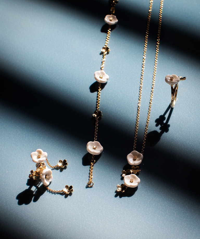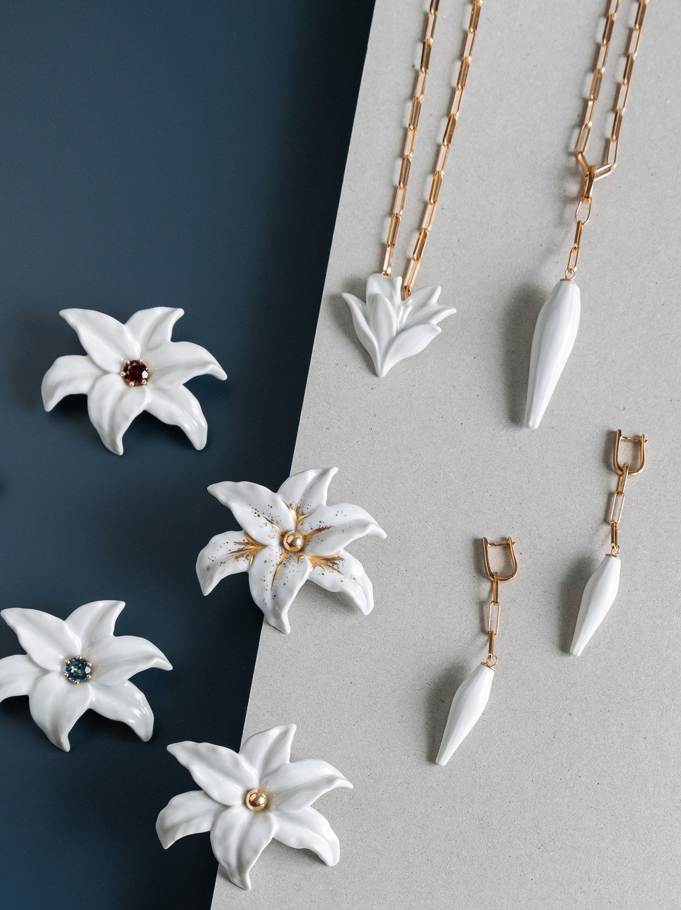The products from the “Bloom Collection” are a special gift that is characterized by modernity, lightness and attention to detail. Nature-inspired design and precision craftsmanship come together in this collection, which includes brooches, earrings and a necklace. The design was inspired by the blossom of a lily, which develops from the first delicate bud into an open, beautiful flower. This collection marks the modern comeback of the brooch, which can be worn classically on a blouse or extravagantly on the waistband of a skirt. Ideal for women who appreciate timeless beauty and sophistication.