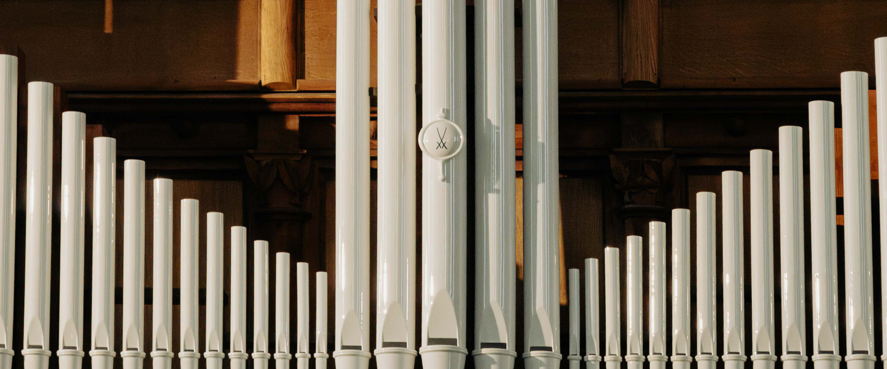 What once seemed a bold dream has now become reality: The Jehmlich organ in the Frauenkirche in Meissen was designed to accommodate porcelain pipes and has now been enhanced with 12 bass and 9 treble pipes, as well as a complete register ranging from c0 to c3 – all crafted from Meissen porcelain. The historic organ, itself a witness to the German organ reform movement and home to the oldest preserved organ pipes in Saxony, has thus been expanded into an acoustic and visual masterpiece.