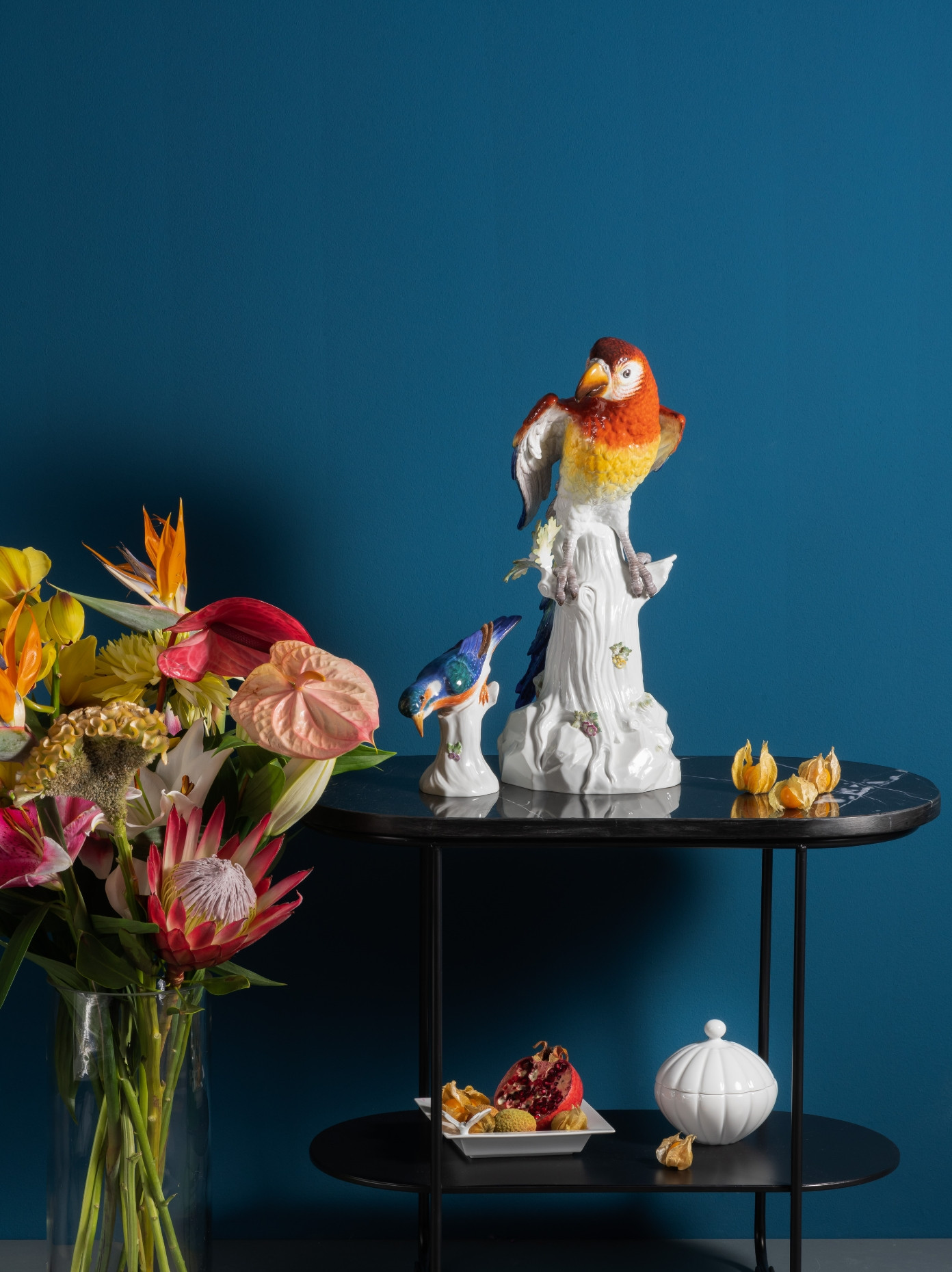 The magnificent rooms in Southeast Asian style are different, guaranteeing a wow effect with symmetrical design, a bold colour scheme, colourful orchids and magnificent porcelain vases. If the journey is to take us to the tropics, it is brilliant colours, exotic animal and plant motifs as well as opulent precious metal accents that we encounter - pineapple tins and leaf bowls as well as hand-painted parrots, leopards and monkeys that find skilful expression in Meissen porcelain.