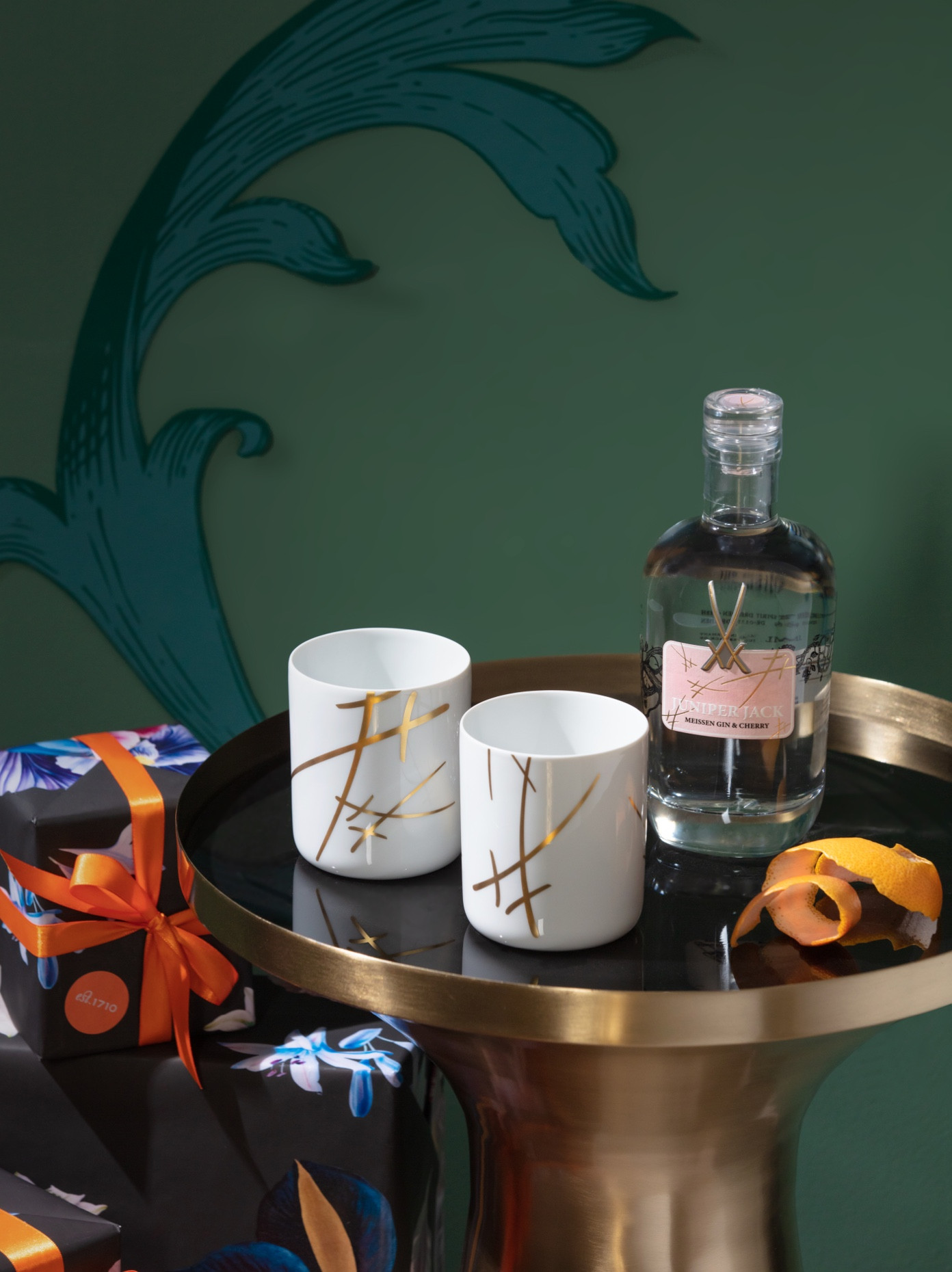 With the new exclusive gift set from MEISSEN X JUNIPER JACK, the cooperation between the two Saxon brands is going into the next phase. This year, the companies present themselves with a joint Juniper Jack Meissen Gin & Cherry - a London Dry Gin with a noble cherry note. The crossed swords, the distinctive trademark of the Meissen porcelain manufactory, not only adorn the label of the bottle, but also the modern gin cups made of finest Meissen porcelain. They are part of the "Swords" collection, with which the legendary signet is presented as an outstanding decoration in the shimmering color of gold. The gin tumblers with a filling volume of 0.15l are shaped like classic tumblers - haptically appealing and large enough to hold several ice cubes. In addition, the porcelain material keeps your gin cool and fresh.