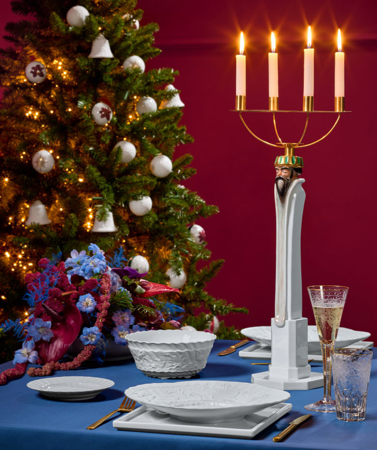 Without further ado, the curious creature made its way towards the living room, where the impressive Christmas tree was already standing - a multitude of gleaming white ornaments, such as the bell with relief, the "MEISSEN Christmas Star" bauble and lots of stars shone in the magical glow of the softly glowing fairy lights. Each individual piece on the magnificently decorated branches literally brought the tree to life and immediately gave the curious creature a warm and cozy feeling of security. Memories came flooding back to him - of proudly helping to hang the baubles himself. Of how the whole family had spent the last few years around the tree in a cheerful mood, until later there was probably the most delicious meal ever cooked. And, of course, the little mystical creature also remembered the countless presents, all of which it was allowed to unwrap with great enthusiasm.