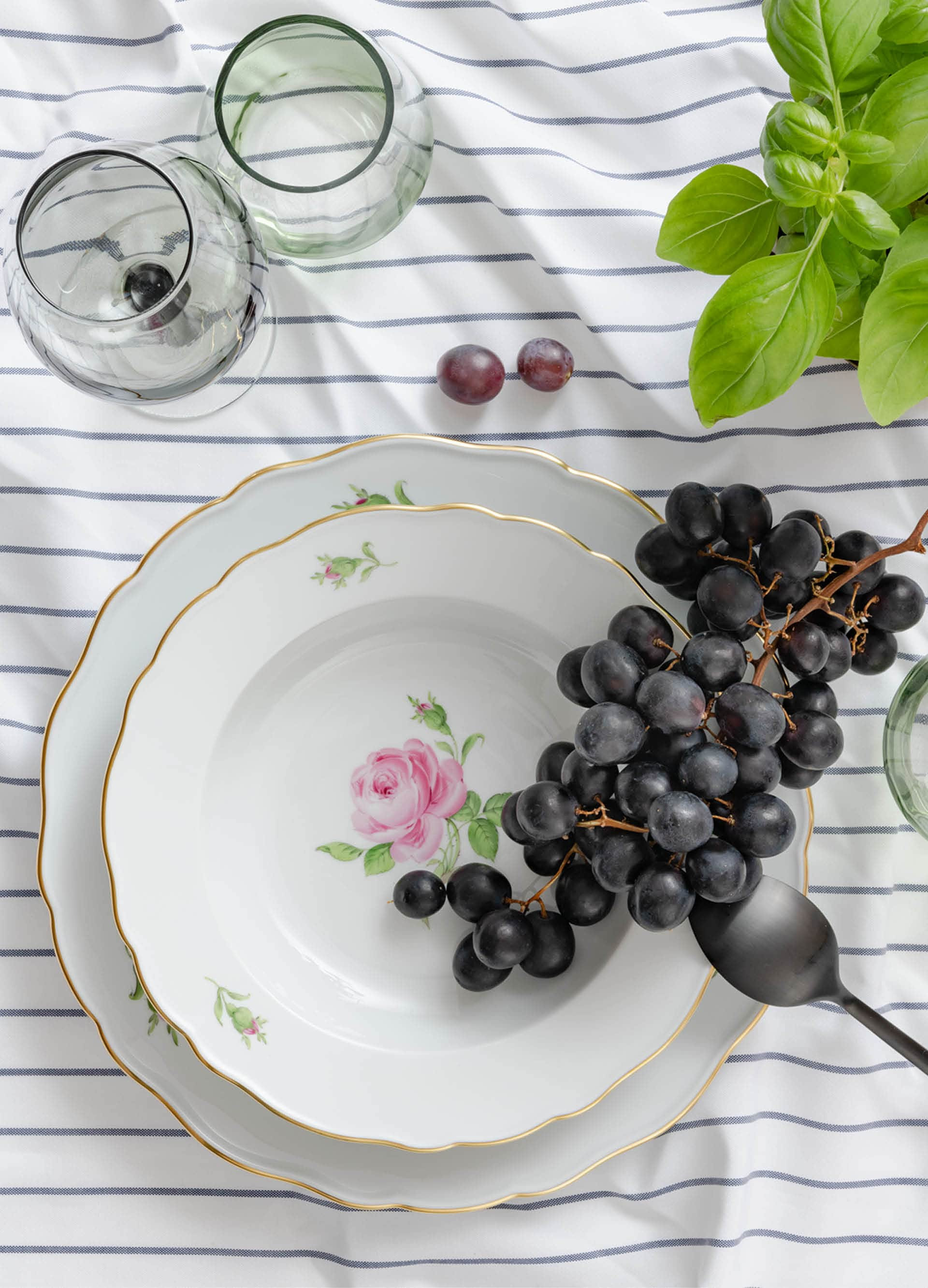Meissen RosePink and white roses with purple centres gracefully intertwined on Meissen porcelain. As its own genre, floral painting on porcelain has a long tradition at the Meissen manufactory that has grown continually throughout the ages and continues on to this day. Much like other decorative motifs, the depiction of blossoming plants on porcelain dates back to the manufactory’s earliest artistic development, which was heavily influenced by East Asian porcelain art. Magnificent naturalistic botanical illustrations would later serve as templates for the flowers depicted on the earliest examples of European porcelain. The “MEISSEN Rose” first blossomed in the Biedermeier era, its style highly reminiscent of the evocative still life paintings by Georg Friedrich Kersting, who was a drawing teacher and the head of flower painting at that time.