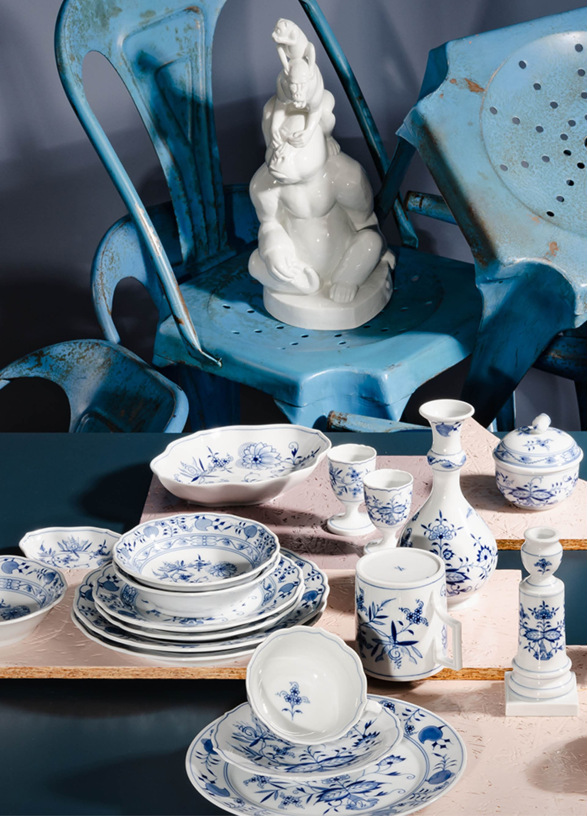 Onion PatternIt is the most successful blue painted pattern in the history of porcelain: in 1739, the radiant blue “Onion Pattern” was developed based on East Asian influences. True to original, the “onions” in the pattern are not in fact onions, but rather peaches and melons on the rim of the plate, and bamboo stalks and delicate chrysanthemum blossoms adorning the centre. In lieu of exotic fruits and flowers to use as templates for their creations, Meissen’s 18th-century artisans’ stylized renditions soon gave rise to their misconception as onions. To this day, Meissen’s “Onion Pattern” is applied to the porcelain by specially trained under-glaze painters. The manufactory’s own cobalt blue is the only paint used for the creation of all Meissen blue porcelain, just as it was 300 years ago. The different shades of blue are all realised with a single colour of paint. -