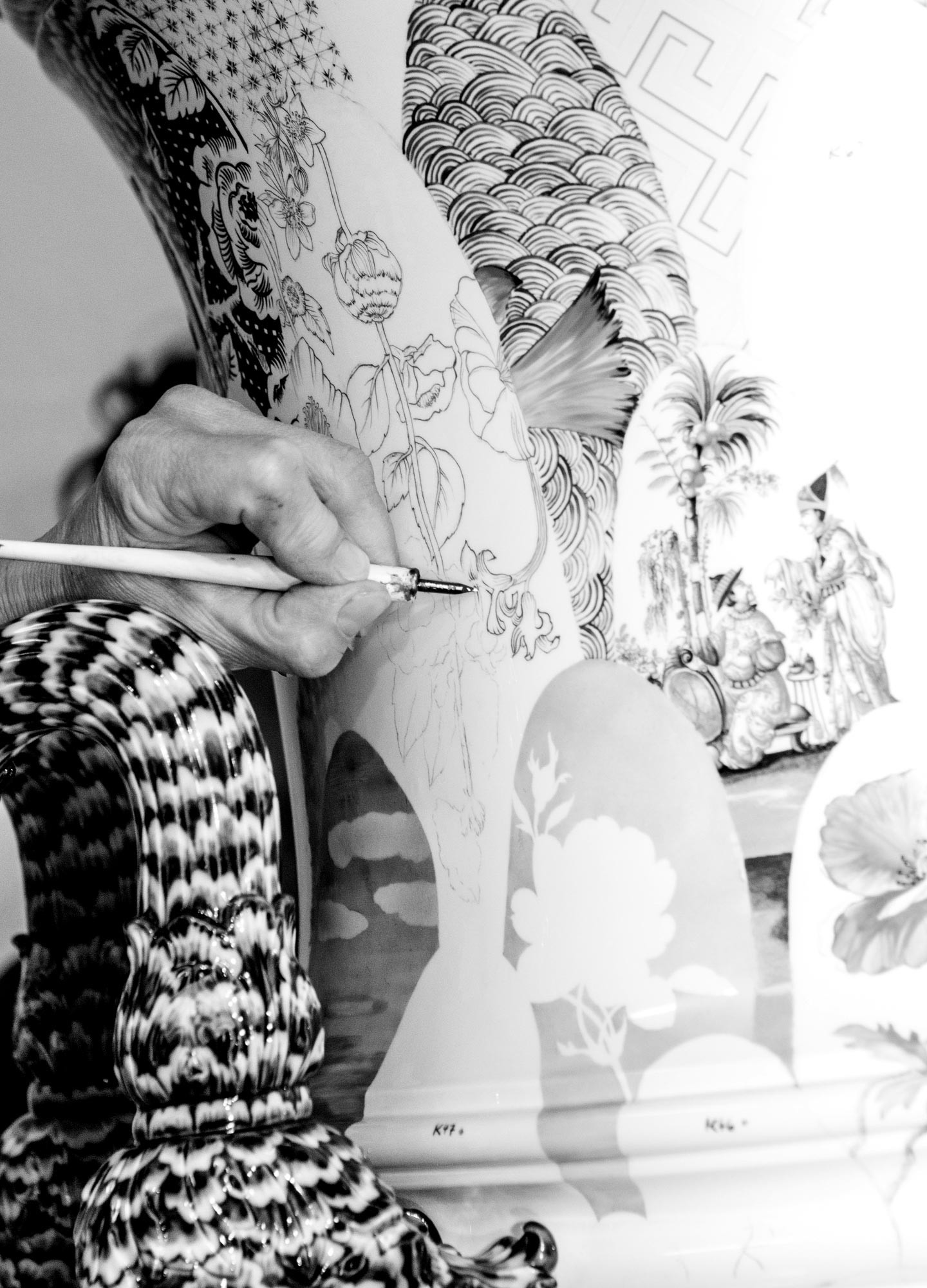 “A lavishly embellished vase with over 100 motifs applied by 27 specialised painters in various techniques. Luters are presented with their very own challenge: the vase's wet mass weighs against its own shape.”