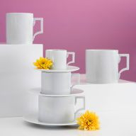 For the full setting, porcelain cups with saucers help the crema hold its shape and keep the teaspoon in place. A coordinated coffee cups set keeps patterns and proportions aligned when you are laying the table for guests. It is easy to extend the look by exploring tableware for the setting and related cups when you want espresso or latte companions in the same mood. Coffee service finds its rhythm with matching coffee pots. A light pastry on a dessert plate completes the scene with a calm gesture. For milk and sweetness presented with the same composure, choose a porcelain milk jug and a sugar box. If you prefer to plan the whole table at once, browse coordinated tableware sets.